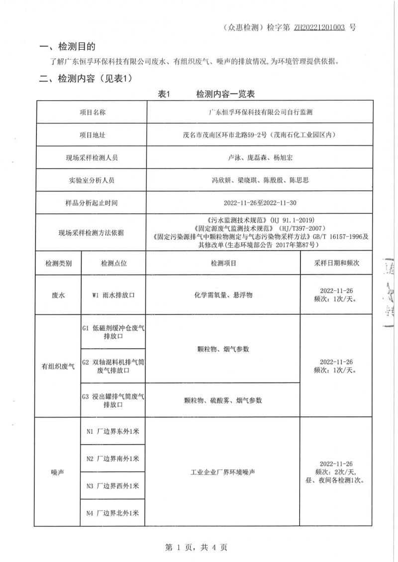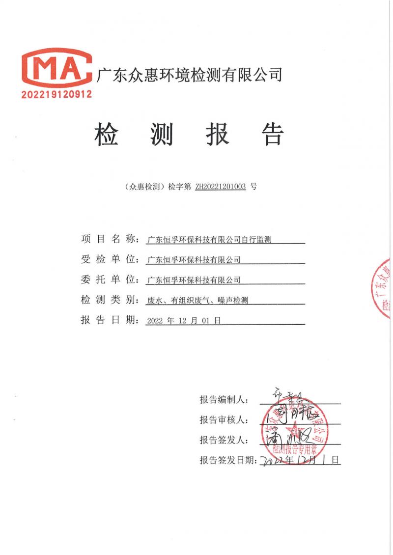 (恒孚)22年11月雨水、有組織廢氣。噪聲檢測(cè)報(bào)告ZH20221201003